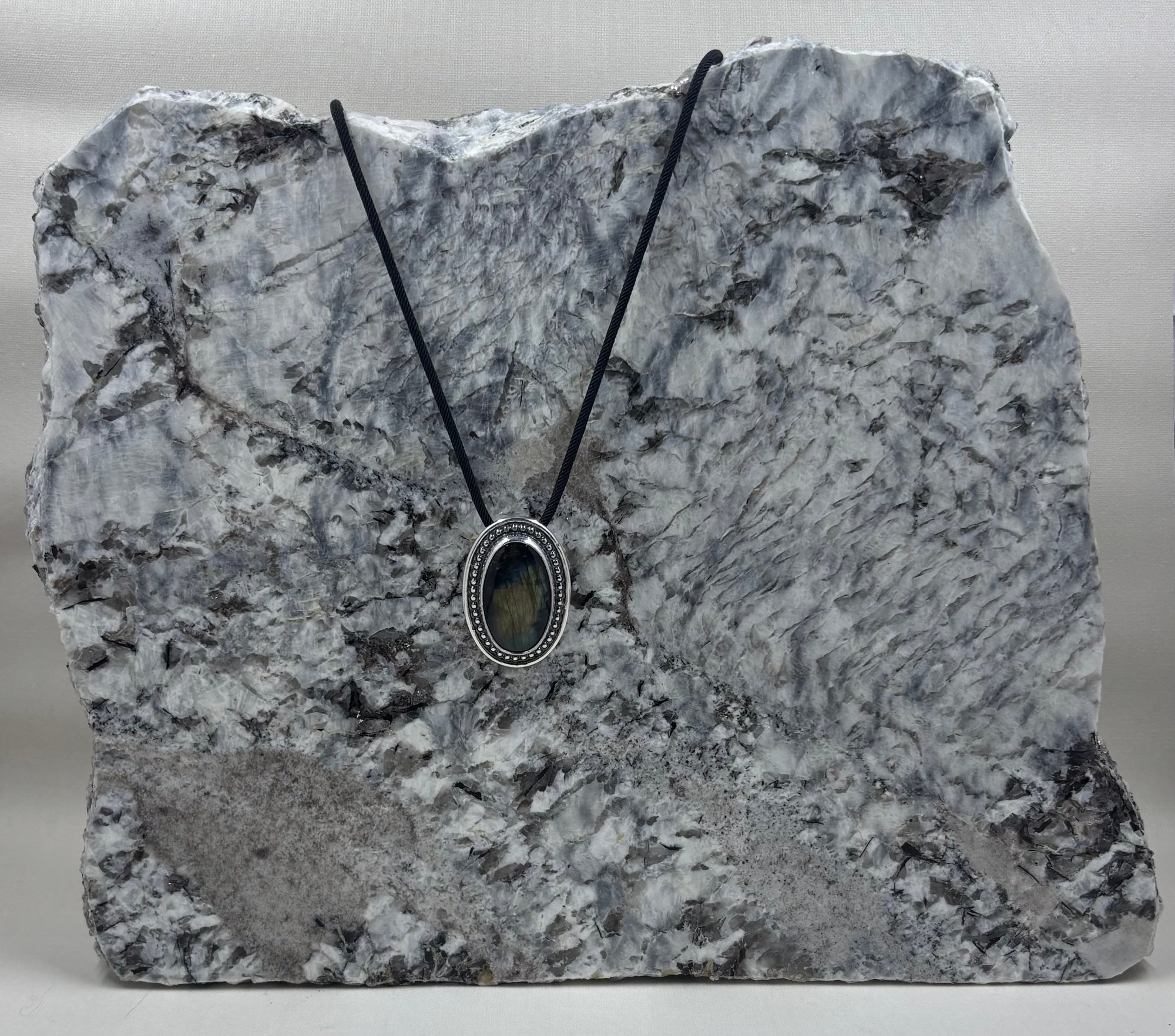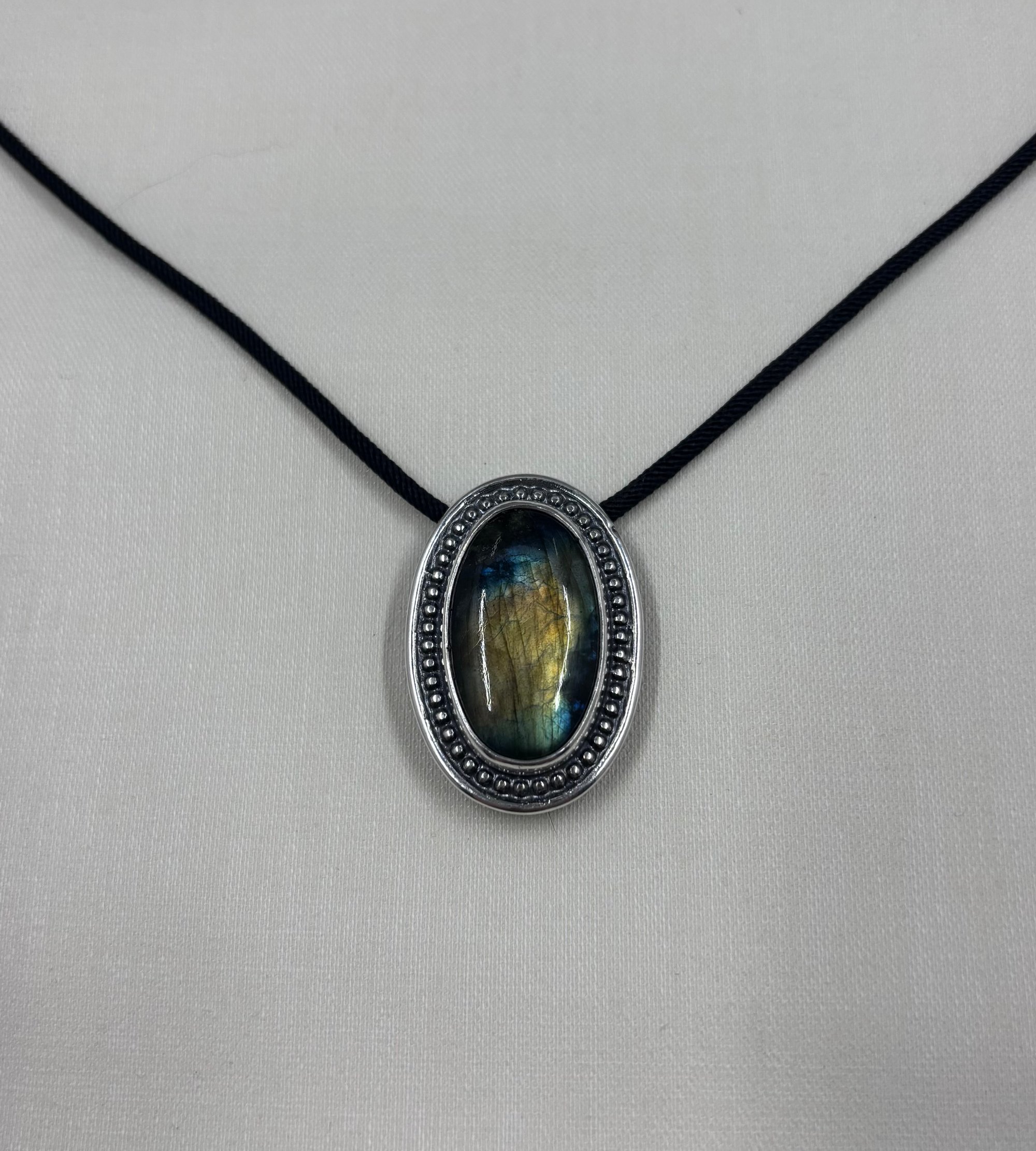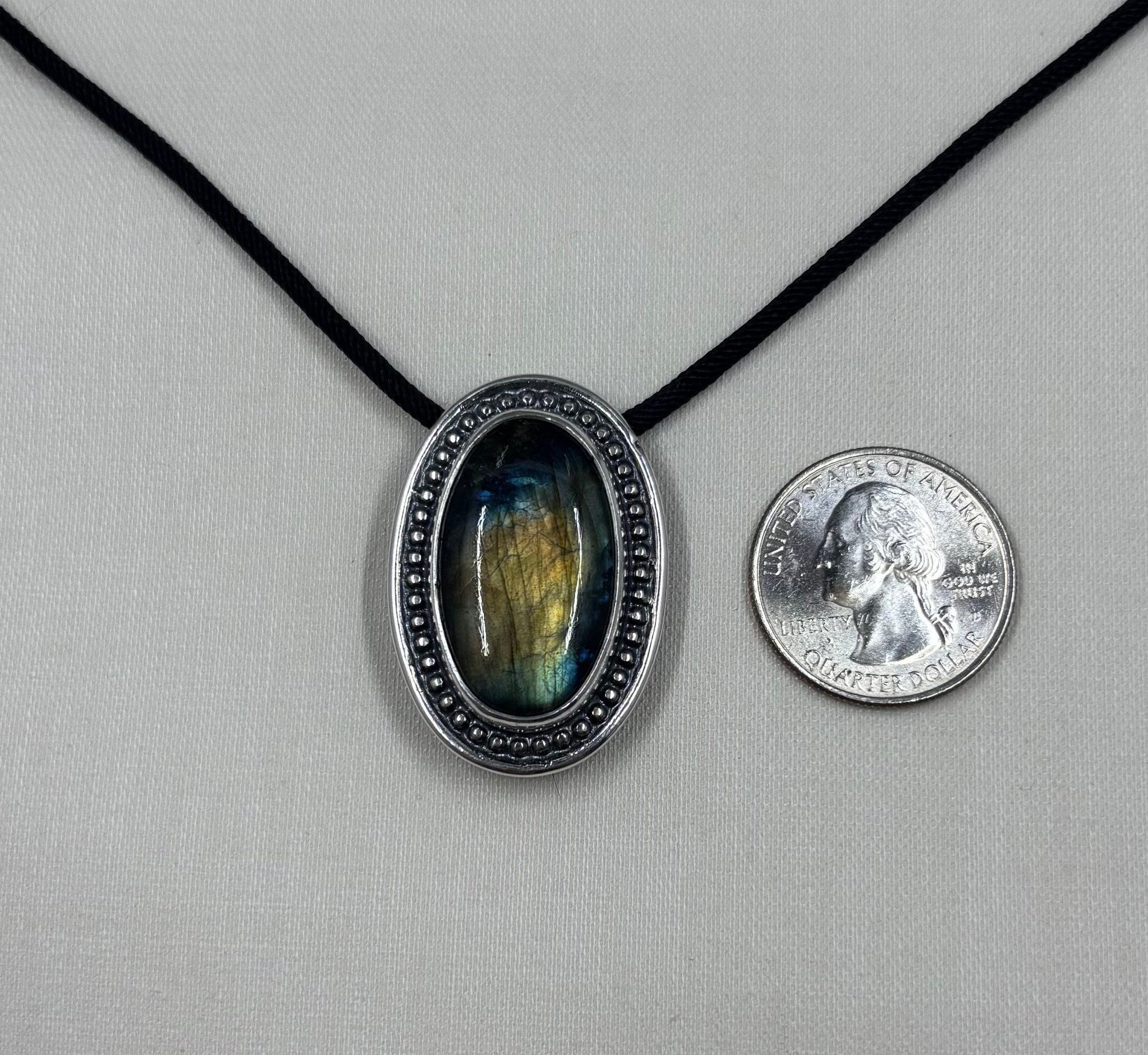 This handmade pendant was made with sterling silver (.925) and features a flashy labradorite cabochon. It has a hidden bail, since this beautiful stone is the star or the show!