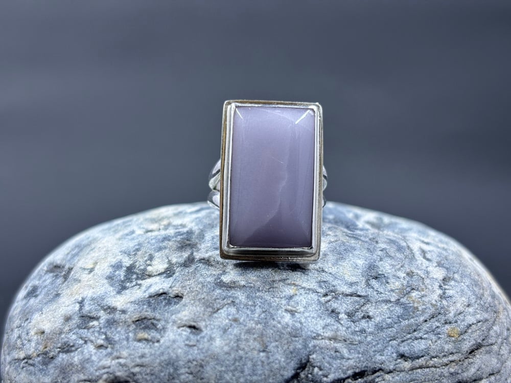 This handmade ring was made with sterling silver (.925) and features a beautiful lavender colored piece of yttrium fluorite, found in Mexico and hand cut/shaped in the shop!