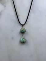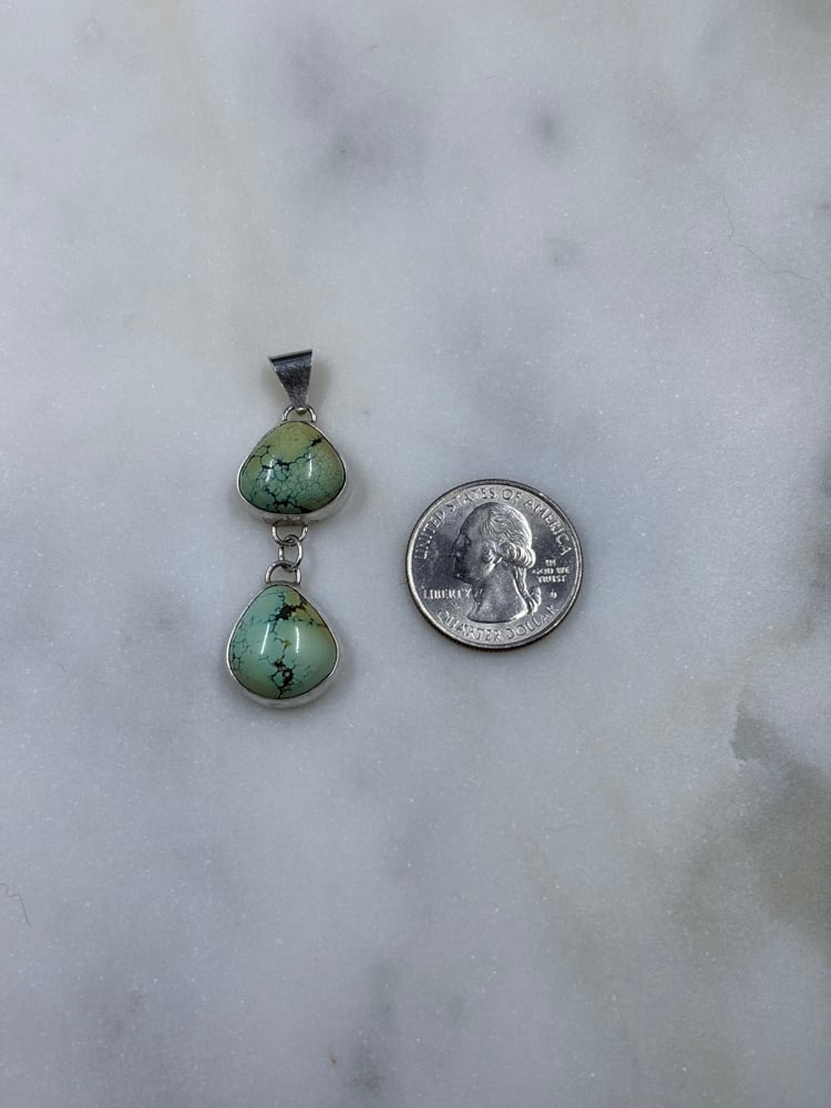This handmade pendant was made with sterling silver (.925) and features two beautiful pieces of green turquoise from the Blue Moon turquoise mine in Nevada!