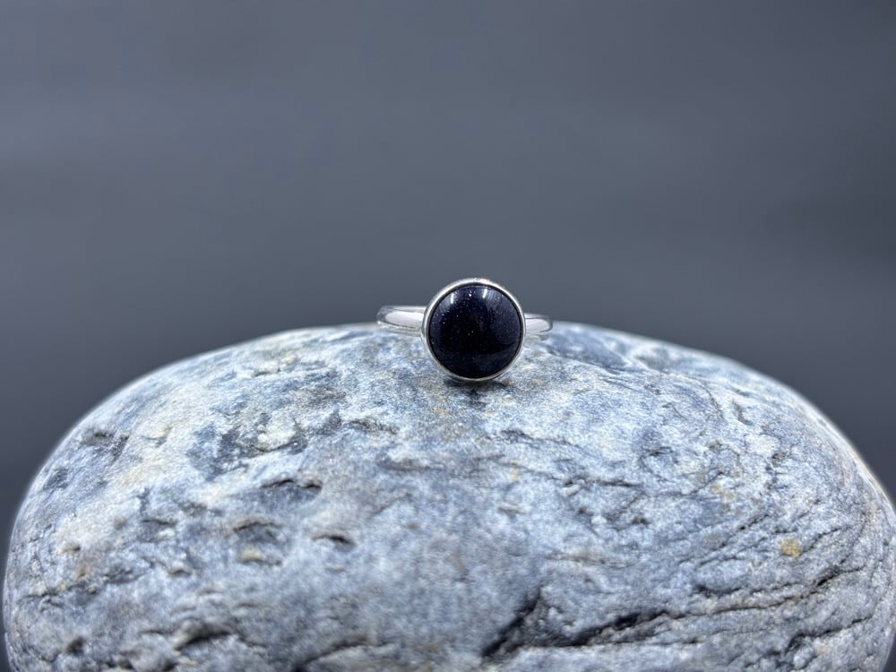 This handmade ring was made with sterling silver (.925) and features a sparkly blue goldstone! Goldstone is a man-made glass material with embedded metal, often copper, which gives it a glittery appearance!